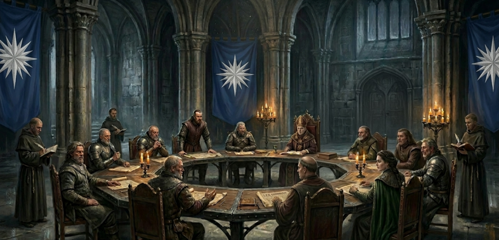Each duke of the Twelve Duchies was granted a seat and a single voice, equal in weight to the others, regardless of land, wealth, or banners borne. To them was added one further chair, set apart but not above: that of the Archbishop of Orion’s Church, who speaks not for a duchy, but for the faith that binds them all. Thus were thirteen voices bound into one deliberative body, charged with the care of the realm entire.
