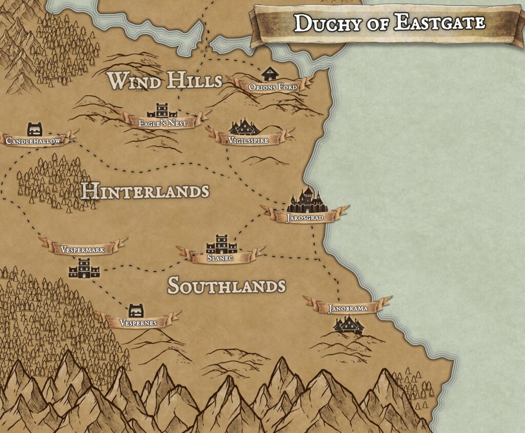 Beyond the last hills, the land hardens into stone. To the east stretches the mountain chain known as the Eastern Cliffs, running from the northern coast down into the south… a long, jagged spine that marks the edge of the duchy’s reach and stands as both a barrier and a warning.