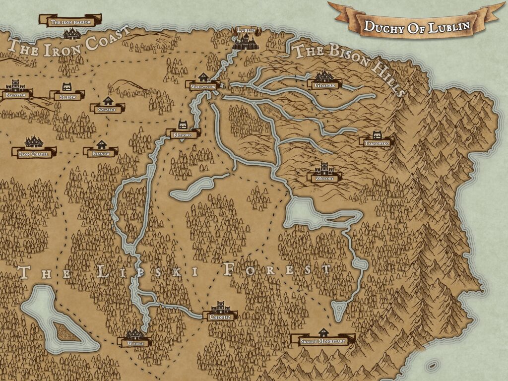 House Jurczak holds the city of Chopisz, set deep within Lipski Forest along the central of the three ducal high roads that cut through the massive woodland like scars made lawful. It is not a border fortress and it is not a port. It is a clearing turned into a crossroads—where wagons and riders are forced to slow, where convoys regroup before risking the darker stretches of the trees, and where any house that controls the inns, granaries, and toll-stations effectively controls the pulse of travel through the duchy.